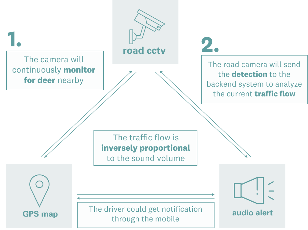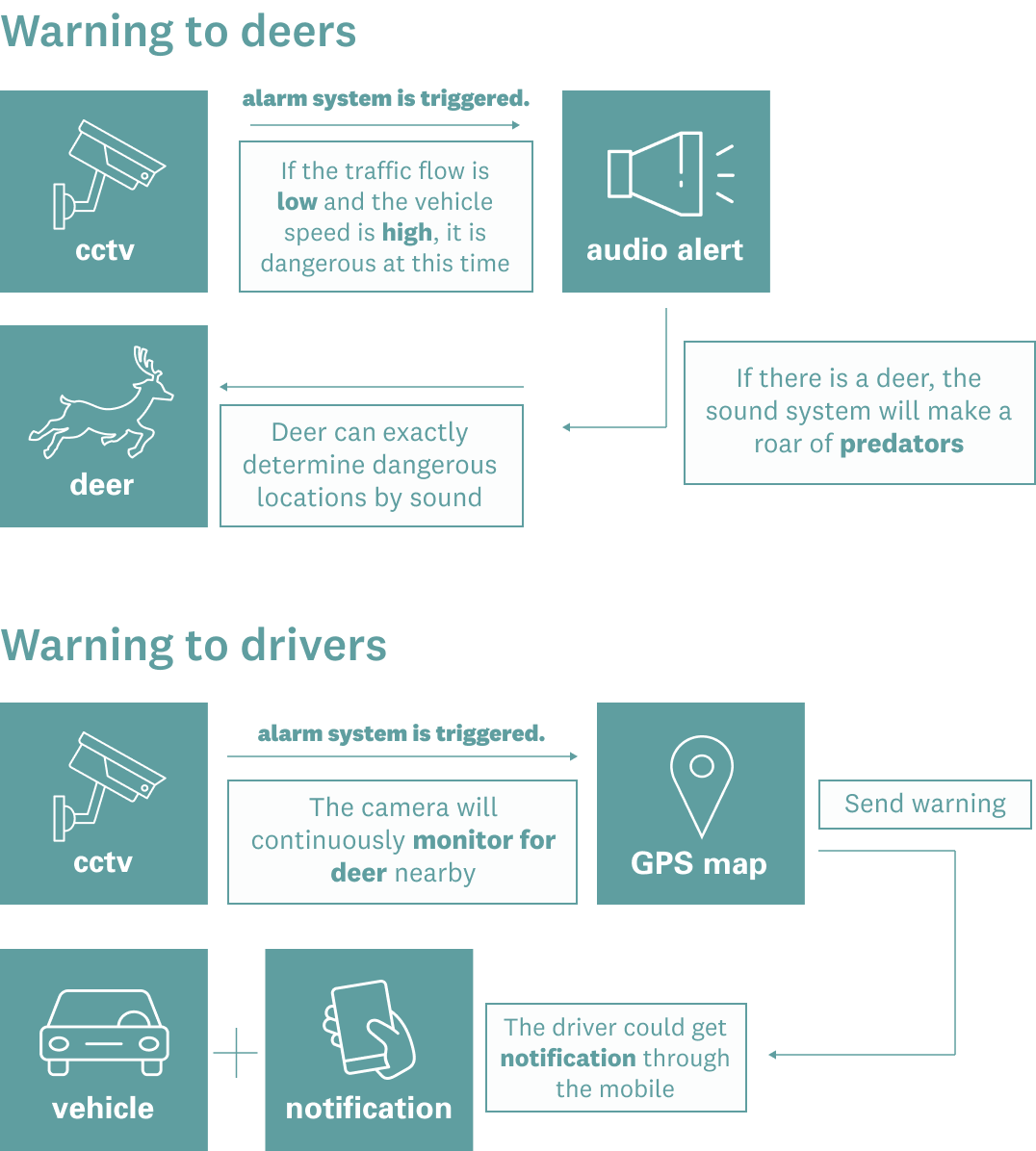 After making a preliminary ideation, I drew a diagram after organizing information, and tried to explore the possibility of using the concept of the Internet of Things to build a platform for deers and drivers. Vehicle, deer, sensor, cctv, and alert, they all represent a part on the chain which influence each other.