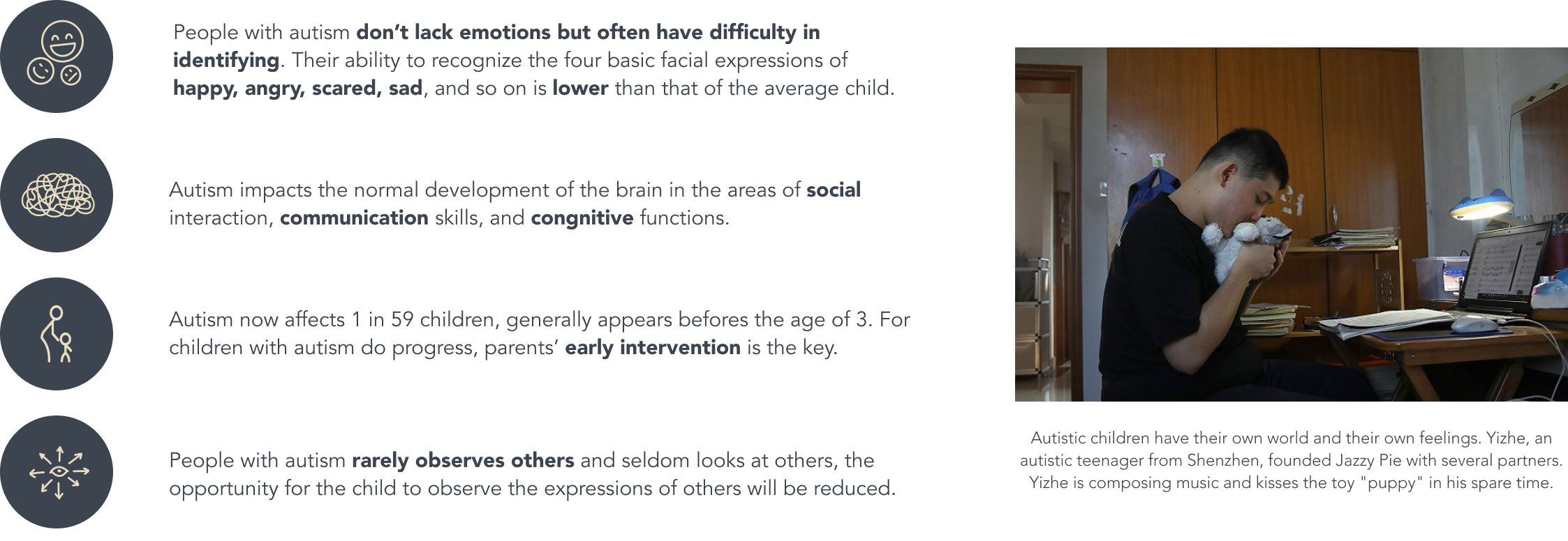 Autism spectrum disorder is often suspected when young children stand out as being different from their peers. When a child with autism is immersed in his own world, he tends to understand other people's emotions according to his own. This feature makes transmit emotions hard.